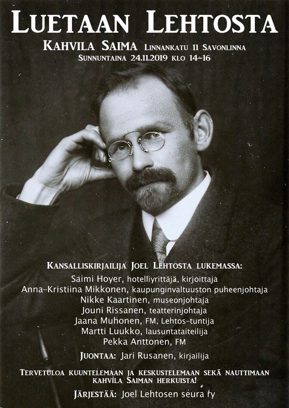 "Luetaan Lehtosta! Tervetuloa sunnuntaina 24.11.2019 klo 14-16 Joel Lehtosen syntymäpäivän sekä 100 vuotta täyttävän Putkinotko-romaanin kunniaksi järjestettävään Luetaan Lehtosta-tapahtumaan Kahvila Saimaan, Linnankatu 11, Savonlinna. Tilaisuudessa lukevat otteita Lehtosen teoksista eri aloilta tunnetut vaikuttajat. Yleisön toivotaan osallistuvan keskusteluun."