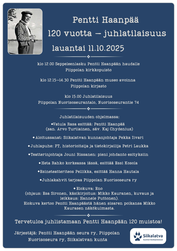 Kirjailija Pentti Haanpään syntymästä tulee kuluneeksi 120 vuotta. Kirjailijaa juhlitaan la 11.10.2025 Piippolassa. Oheisessa liitteeessä juhlapäivän ohjelma.