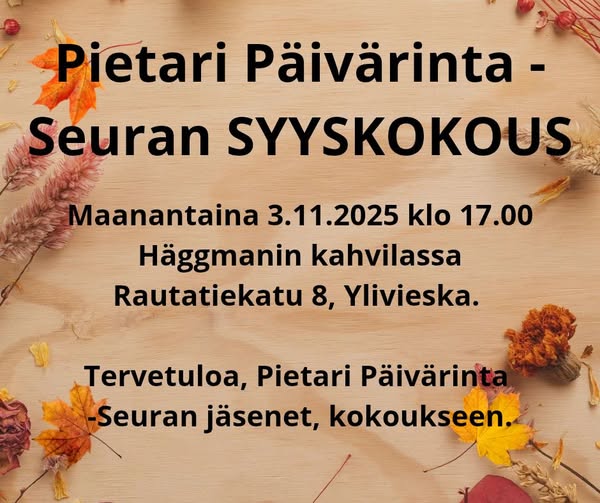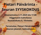 Pietari Päiväri-seuran syyskokous ma 3.11.2025 klo 17.00