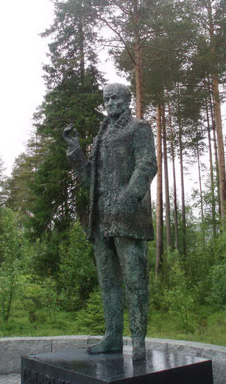 Kuvanveistäjä Kain Tapperilta tilattua patsasta varten oli kerätty 100.000 markkaa ja patsas siirrettiin sittemmin 1998 huonosti näkyvästä Kiannonpuistosta Jalonniemen rantaan, jossa se on lähempänä viitostietä ajavia turisteja, vaikka koivut sen jo siinäkin kohta peittävät näkyvistä. Patsaan paikka tuntuu kuntalaisten keskuudessa olevan kestopuheenaihe, onkin ehdotettu että patsas pitäisi sijoittaa pyörille. Vappuna kivinen kirjailija on toisinaan saanut ylioppilaslakin päähänsä, jonakin yön hetkenä tyhjän likööripullon käteensä.