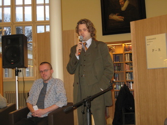 Tilaisuuden juontavat kirjailijat Joni Pyysalo ja Jouni Teittinen.