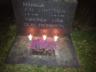 ![]() Hietaniemen hautausmaalla Pekka Tarkka, Sirkka-Liisa Hentilä ja Hilkka Vento. Kuva: Jaana Muhonen | ![]() 20.11.2014 sytytimme kynttilät Joel Lehtosen haudalle Hietaniemen hautausmaalla. Kuva: Jaana Muhonen |